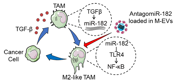 研究生馬呈鑫、何大灑、田璞等在胡國宏研究員的指導(dǎo)下發(fā)現(xiàn)乳腺癌細(xì)胞通過TGFβ信號(hào)通路誘導(dǎo)miR-182在巨噬細(xì)胞中的高表達(dá),而miR-182通過直接抑制下游TLR4基因的表達(dá)導(dǎo)致巨噬細(xì)胞中NFκb信號(hào)通路的失活,進(jìn)而造成巨噬細(xì)胞向促腫瘤M2表型的極化,最終促進(jìn)了乳腺癌的發(fā)生與發(fā)展。更重要的是,在多種乳腺癌模型中他們還發(fā)現(xiàn)使用陽離子化甘露聚糖修飾的細(xì)胞外囊泡可以將miR-182抑制劑antagomiR-182靶向性地遞送到腫瘤中巨噬細(xì)胞,有效地抑制其miR-182的表達(dá),進(jìn)而遏制M2表型極化,最終減緩乳腺癌的發(fā)展和惡化。