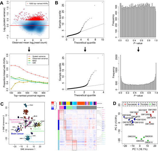圖:(A) HyperChIP模型以校正了均值-方差關(guān)系的標(biāo)度方差(scaled variance)為統(tǒng)計(jì)指標(biāo), 使不同信號(hào)強(qiáng)度水平的基因組區(qū)域之間的信號(hào)差異水平更加可比。(B)通過(guò)引入?yún)^(qū)域篩選和縮尾處理等手段來(lái)控制潛藏真陽(yáng)性對(duì)參數(shù)估計(jì)的影響,顯著改善了HVR識(shí)別的統(tǒng)計(jì)功效。(C)將HyperChIP應(yīng)用于TCGA pan-cancer ATAC-seq數(shù)據(jù)集,基于所得HVRs將部分組織來(lái)源或細(xì)胞形態(tài)相近的樣本歸類定義為四個(gè)癌癥超類型(super class),即腦部腫瘤(Brain cancer)、腎癌(Kidney carcinoma)、消化道腺癌(Digestive adenocarcinoma)和鱗狀細(xì)胞癌(Squamous cell carcinoma);下游的轉(zhuǎn)錄因子活性打分分析,發(fā)現(xiàn)了大量被每個(gè)超家族中腫瘤樣本所共有的轉(zhuǎn)錄調(diào)控因子。(D)比較十余個(gè)不同人類個(gè)體的淋巴母細(xì)胞系CTCF ChIP-seq數(shù)據(jù),發(fā)現(xiàn)基于所得HVRs能很好地區(qū)分不同種群個(gè)體的樣本。