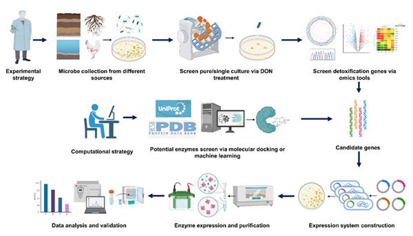 圖示:基于實驗富集篩選和數(shù)據(jù)驅(qū)動的計算模擬方法挖掘新型真菌毒素降解酶