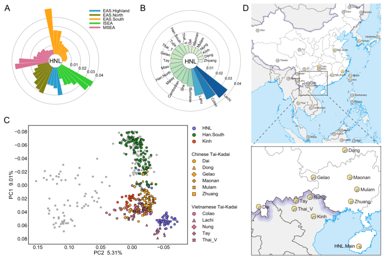 2022年9月30日,分子進(jìn)化領(lǐng)域知名國(guó)際期刊《Molecular Biology and Evolution》在線發(fā)表了中國(guó)科學(xué)院上海營(yíng)養(yǎng)與健康研究所的研究成果“Tracing Bai-Yue ancestry in aboriginal Li people on Hainan Island”。研究團(tuán)隊(duì)基于全基因組測(cè)序數(shù)據(jù)分析研究了海南黎族(HNL)的遺傳起源、群體歷史和適應(yīng)性進(jìn)化;并結(jié)合我國(guó)和越南的侗傣語(yǔ)系族群,重構(gòu)了“百越”族群的遺傳演化模型;為深入了解我國(guó)上古人群與當(dāng)今中華民族的歷史淵源提供了基因證據(jù)和遺傳學(xué)視角。