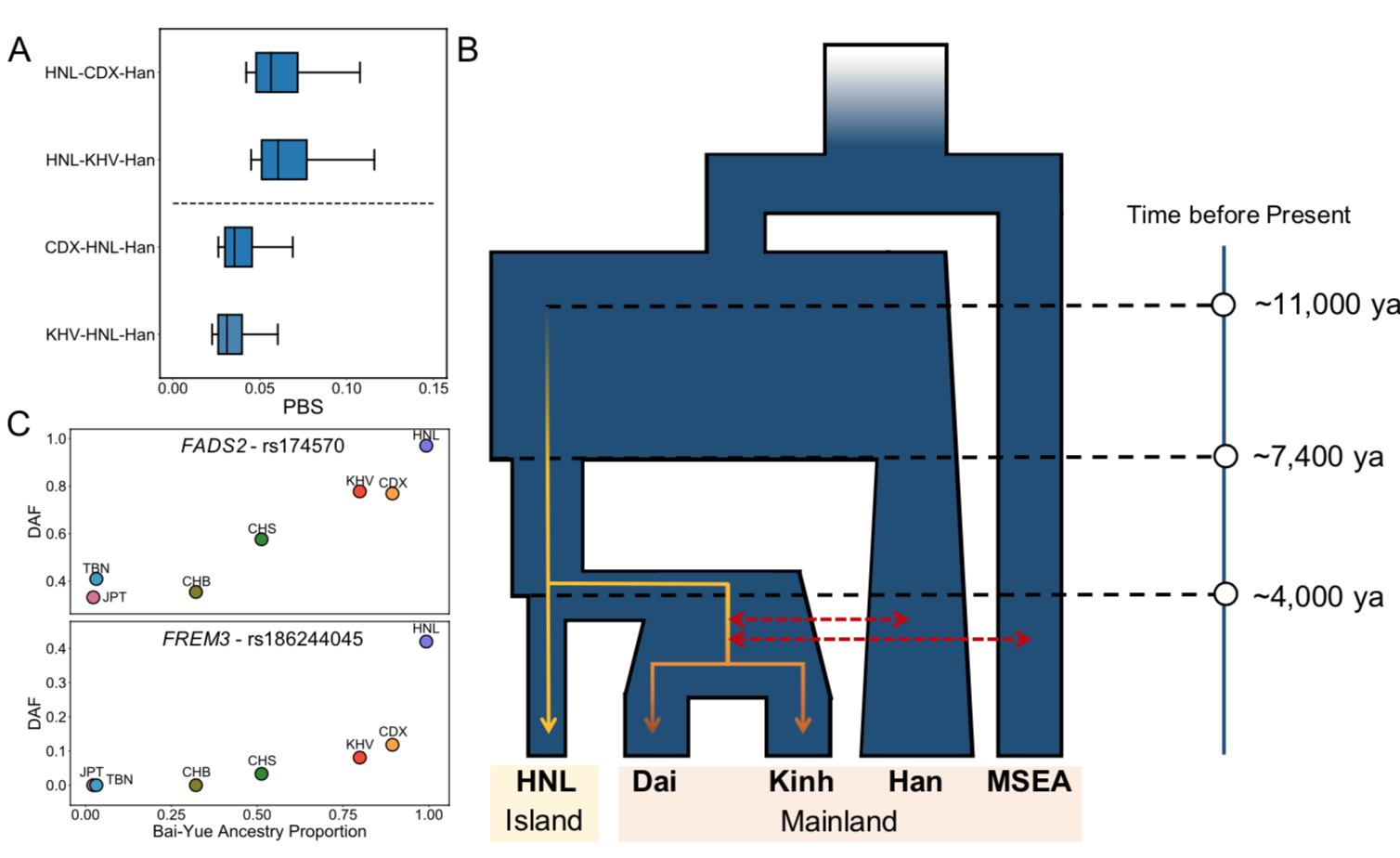 此外,研究團(tuán)隊(duì)還對(duì)海南黎族的適應(yīng)性進(jìn)化進(jìn)行了探究。研究團(tuán)隊(duì)首先在海南黎族中鑒定出和多不飽和脂肪酸代謝相關(guān)的FADS1和FADS2中存在選擇信號(hào),并發(fā)現(xiàn)該信號(hào)在東亞南北方地區(qū)存在差異,且在黎族中衍生等位基因的頻率最高(圖3)。同時(shí),研究團(tuán)隊(duì)還發(fā)現(xiàn)海南黎族存在多個(gè)與瘧疾相關(guān)的基因(如CR1)以及與B細(xì)胞淋巴瘤等血液疾病相關(guān)的基因(如CD3G)上發(fā)生的適應(yīng)性選擇信號(hào),且海南黎族的適應(yīng)性選擇信號(hào)顯著富集到與造血功能相關(guān)的通路中。這很可能是因?yàn)槲挥跓釒У貐^(qū)的海南島上過(guò)去的瘧疾發(fā)病率較高,位于島上的黎族先民在瘧疾的選擇壓力下而產(chǎn)生了一系列與血液疾病相關(guān)的權(quán)衡。最后,研究團(tuán)隊(duì)還結(jié)合百越族群的群體歷史和適應(yīng)性進(jìn)化特征,構(gòu)建了百越族群的遺傳演化模型(圖3)。