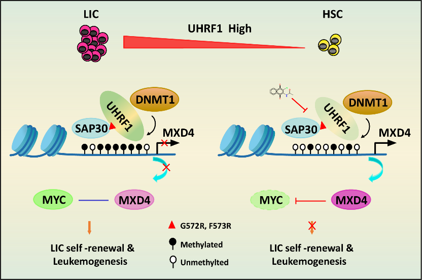圖. UHRF1調(diào)節(jié)AML的分子機(jī)制示意圖。