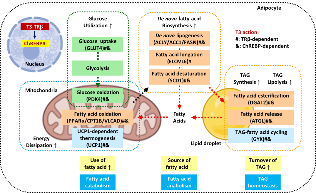 機(jī)制研究發(fā)現(xiàn),在iWAT中T3以TRβ依賴的方式調(diào)控一個重要的轉(zhuǎn)錄因子ChREBP的表達(dá)。體外實驗提示,ChREBP介導(dǎo)了T3對糖脂代謝及能量代謝關(guān)鍵基因的表達(dá)。以往的研究提示,白色脂肪細(xì)胞ChREBP可通過促進(jìn)胞內(nèi)脂肪酸從頭合成,改善全身代謝,于是該研究還分析了脂肪細(xì)胞TRβ的缺失的后果。發(fā)現(xiàn)ATRβKO小鼠iWAT的脂肪酸從頭合成相關(guān)基因表達(dá)下調(diào),更易發(fā)生飲食誘導(dǎo)的肥胖和代謝失調(diào)。該研究不但表明脂肪組織內(nèi)的TH作用對于全身代謝穩(wěn)態(tài)也具有調(diào)控作用,而且還揭示了脂肪TH-TRβ信號通路通過ChREBP調(diào)控脂肪細(xì)胞代謝和全身代謝的新機(jī)制,為靶向脂肪組織的TRβ激動劑的研發(fā)和臨床應(yīng)用提供了理論基礎(chǔ)。