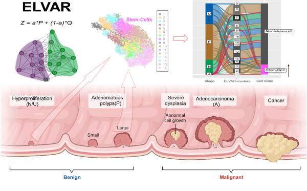 圖例:ELVAR算法可利用不同階段結(jié)直腸腺癌的單細(xì)胞核RNA-Seq數(shù)據(jù)檢測(cè)關(guān)鍵細(xì)胞類型的豐度。如圖所示,腸干細(xì)胞豐度在息肉中相對(duì)于正常組織有所增加。