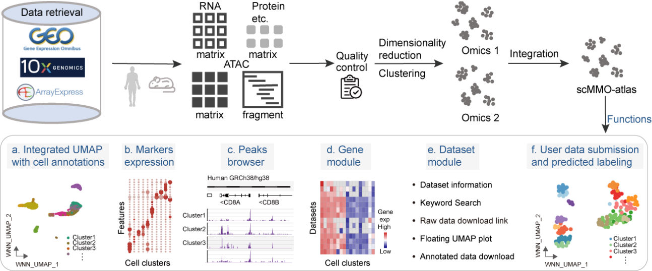 該研究收集和整合了70多個高質(zhì)量的單細胞多模態(tài)組學(xué)數(shù)據(jù)集,構(gòu)建了scMMO-atlas數(shù)據(jù)庫?(https://www.biosino.org/scMMO-atlas/),包括來自852個樣本的3,168,824個細胞的單細胞多模態(tài)組學(xué)數(shù)據(jù)。scMMO-atlas提供了一個交互式的門戶網(wǎng)站,提供多種模態(tài)和整合數(shù)據(jù)的可視化和特征分析,包括細胞類型注釋,細胞亞群的表達標簽,細胞亞群特異性染色質(zhì)可及性,基因模塊和數(shù)據(jù)集模塊,并提供用戶上傳數(shù)據(jù)和分析結(jié)果下載。