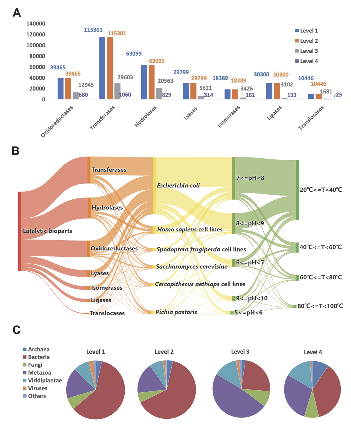 圖1:RDBSB數(shù)據(jù)概況。(A)催化元件在ENZYME數(shù)據(jù)庫分類的分布情況。(B)經(jīng)實驗驗證的催化元件在酶類別、底盤、最佳pH值和最佳溫度的分布。(C)根據(jù)NCBI分類法分類的元件來源生物的分布情況。