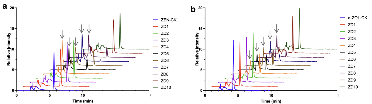 圖2:ZEN與ZOL及其降解產(chǎn)物的色譜圖