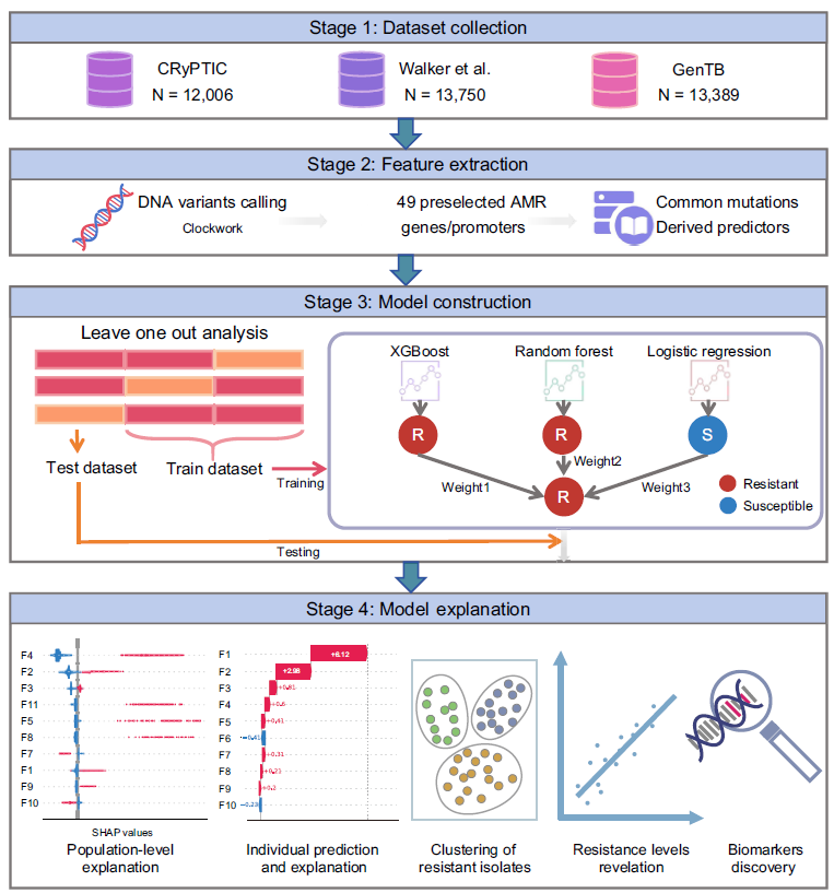 結(jié)核病是由結(jié)核分枝桿菌(Mycobacterium tuberculosis, MTB)引起的全球性細(xì)菌傳染病,2023年全球約有1060萬新發(fā)病例并導(dǎo)致130萬人死亡。耐藥結(jié)核病的出現(xiàn)顯著降低了治療成功率,進(jìn)一步加劇了結(jié)核病防控的難度。近年來,機(jī)器學(xué)習(xí)方法已被用于從基因組數(shù)據(jù)中識(shí)別與耐藥相關(guān)的復(fù)雜模式,但現(xiàn)有研究多停留在群體層面的統(tǒng)計(jì)關(guān)聯(lián),缺乏對(duì)單個(gè)菌株耐藥機(jī)制的可解釋性分析,而這一層面的解析對(duì)于理解特定突變?nèi)绾谓閷?dǎo)耐藥具有關(guān)鍵意義。因此,亟需能夠同時(shí)提供群體層面“全局解釋”和個(gè)體層面“局部解釋”的預(yù)測(cè)模型:前者用于系統(tǒng)評(píng)估突變對(duì)耐藥性的整體貢獻(xiàn),后者用于揭示具體菌株耐藥表型的關(guān)鍵驅(qū)動(dòng)因素。