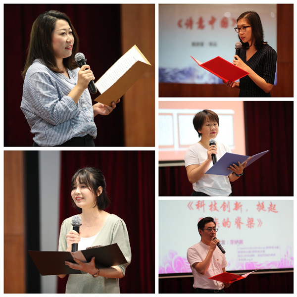 在初賽環(huán)節(jié),主辦方共收到來自岳陽路園區(qū)內(nèi)近30份各具特色的朗讀作品,經(jīng)初評共有10位(9組)選手入圍現(xiàn)場決賽環(huán)節(jié)。其中,一號選手王慧媛用她溫婉的語調(diào)帶來描寫親情的朗讀作品《背影》;二號選手常安妮的一首《我有一個可愛的祖國》,讓觀眾仿佛置身于祖國秀美的畫卷中;三號選手姚遠則娓娓道來,《詩意中國》溫潤祥和;四號選手陸嬌用飽滿的情感生動地詮釋了朗讀作品《趙云霄寫給女兒啟明》;五號選手李禎祺用沙畫為背景精彩的演繹了朗誦作品《科技創(chuàng)新,挺起民族的脊梁》;六號選手朱培英則帶來了她自創(chuàng)作品《哦,我的故鄉(xiāng)》,讓現(xiàn)場觀眾印象深刻;七號選手王思敏、曾春玲組合與九號選手管興華均選擇了《我的祖國》作為朗誦內(nèi)容,但他們用不同的形式展現(xiàn)各自心中對祖國母親的熱愛之情;八號選手劉志睿則用英文朗誦的方式展示了他的朗誦作品《壯哉!中國共產(chǎn)黨》。最終,經(jīng)過激烈角逐,由朱培英同志帶來的原創(chuàng)作品獲得朗讀者比賽的桂冠。