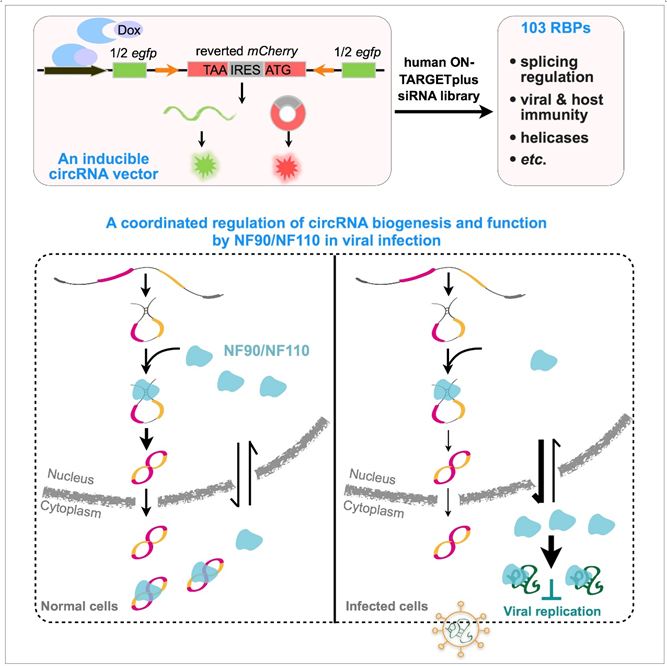 圖: 全基因組篩選以及NF90/NF110對(duì)circRNA表達(dá)和病毒免疫功能的調(diào)控機(jī)制
