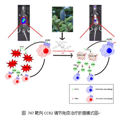 在王慧研究員指導(dǎo)下,博士生姚文博等篩選到一個(gè)天然CCR2拮抗劑747,通過體內(nèi)外實(shí)驗(yàn)確證了其具有良好的選擇性、敏感性和安全性,可以通過阻止腫瘤巨噬細(xì)胞浸潤(rùn)并使巨噬細(xì)胞分化為抑制腫瘤的表型,增加CD8+T細(xì)胞的數(shù)量并增強(qiáng)CD8+T細(xì)胞的殺傷能力來抑制肝癌發(fā)展,并且作為免疫調(diào)節(jié)劑聯(lián)合低劑量的肝癌靶向治療藥物索拉菲尼,可增強(qiáng)索拉菲尼的治療效果。綜上,該研究發(fā)現(xiàn)了一種名為747的新型天然CCR2拮抗劑,為CCR2拮抗劑的開發(fā)提供了新的視角,并表明免疫調(diào)節(jié)劑與化療藥物聯(lián)合使用可能是肝癌治療的一種新策略。