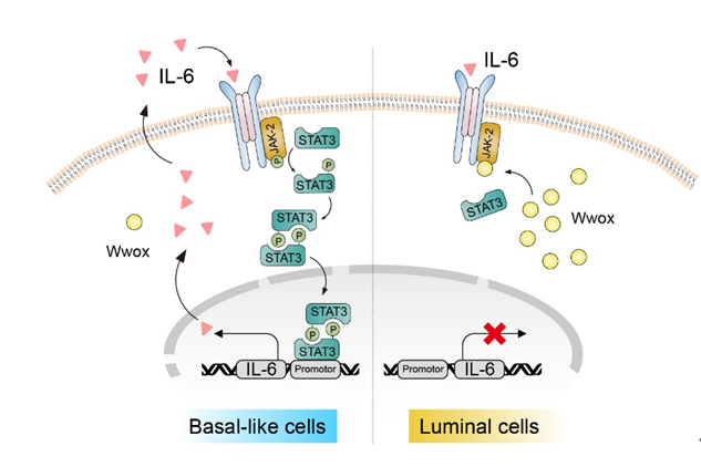 圖:脆性位點基因Wwox作為抑制子在三陰性乳腺癌中與IL6/JAK2/STAT3通路持續(xù)活化呈負相關(guān)及其作用模式圖
