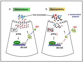 2019年3月19日,國際學(xué)術(shù)期刊Gastroenterology在線發(fā)表了中國科學(xué)院上海營養(yǎng)與健康研究所郭非凡研究組和同濟大學(xué)附屬第十人民醫(yī)院劉占舉教授研究組的最新合作研究成果“ATF4 Deficiency Promotes Intestinal Inflammation in Mice by Reducing Uptake of Glutamine and Expression of Antimicrobial Peptides”。該研究發(fā)現(xiàn)激活轉(zhuǎn)錄因子4(activating transcription factor 4, ATF4)通過結(jié)合啟動子上氨基酸應(yīng)答元件(AARE)直接轉(zhuǎn)錄激活谷氨酰胺(Gln)轉(zhuǎn)運體基因SLC1A5表達,進而調(diào)控腸道上皮細胞中Gln水平,從而維持潘氏細胞分泌抗微生物肽的功能,揭示了氨基酸感應(yīng)蛋白ATF4在維持腸道潘氏細胞分泌和調(diào)控腸道炎癥的新功能。