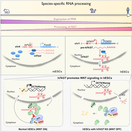 在這項研究中,科研人員基于細(xì)胞核和細(xì)胞質(zhì)分離的人、鼠胚胎干細(xì)胞來源的高通量測序數(shù)據(jù),針對序列及基因組位置保守的一類長非編碼RNA進(jìn)行了加工及亞細(xì)胞定位分析,發(fā)現(xiàn)人胚胎干細(xì)胞中長非編碼RNA更多地定位于細(xì)胞質(zhì),而小鼠胚胎干細(xì)胞中長非編碼RNA則更多地滯留于細(xì)胞核。實驗上進(jìn)一步證明了人、鼠不同亞細(xì)胞定位的長非編碼RNA具有不同功能并詳細(xì)解析了其中一個新型的長非編碼RNA——hFAST維持人胚胎干細(xì)胞自我更新的分子機(jī)制。為了進(jìn)一步探究長非編碼RNA在不同物種間加工定位差異的分子機(jī)制,研究人員結(jié)合生物信息學(xué)分析預(yù)測和實驗驗證篩選到了調(diào)控它們不同定位的關(guān)鍵因子PPIE。分析發(fā)現(xiàn)在鼠、猴、人胚胎干細(xì)胞中PPIE表達(dá)成下降趨勢,而長非編碼RNA加工水平則成上升趨勢,且長非編碼RNA在人胚胎干細(xì)胞中更加傾向定位在細(xì)胞質(zhì)中。深入實驗分析進(jìn)一步證明了PPIE蛋白對長非編碼RNA(包括FAST)的剪接加工及亞細(xì)胞定位的調(diào)控作用。上述研究首次揭示了非保守的RNA加工和定位對長非編碼RNA功能發(fā)揮的重要作用,從而提示長非編碼RNA的姿態(tài)萬千可能是物種特異性的調(diào)控和適應(yīng)的一個重要機(jī)理,為物種差異長非編碼RNA的研究提供了新基礎(chǔ)和新思路。