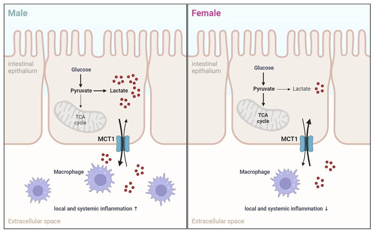 陳雁研究組通過構(gòu)建腸上皮特異性敲除MCT1的小鼠,發(fā)現(xiàn)MCT1敲除能夠影響多種代謝表型,并且很多表型具有性別特異性。其中,腸道MCT1敲除可以改善雄性小鼠的糖代謝穩(wěn)態(tài),增強(qiáng)葡萄糖耐受和胰島素敏感性,但對雌性小鼠的脂代謝功能和體重具有消極影響。通過對敲除小鼠腸道的轉(zhuǎn)錄組進(jìn)行分析發(fā)現(xiàn),MCT1腸道特異性敲除對特定基因表達(dá)的影響存在明顯的性別差異。其中,雄鼠的差異基因主要富集在與炎癥相關(guān)的信號通路。進(jìn)一步的實(shí)驗(yàn)表明雄鼠在腸道敲除MCT1后腸道組織間液的乳酸濃度降低,血液中炎性因子TNF 和趨化因子CCL2水平降低,腸道巨噬細(xì)胞的浸潤下降,同時(shí)腸道抗炎蛋白Reg3家族基因表達(dá)升高,而這些表型并未在雌鼠中觀測到。另外,研究發(fā)現(xiàn),對雄鼠進(jìn)行雌激素處理可以降低腸道組織間液的乳酸水平,并消除由于MCT1敲除引起的糖代謝改善表型。該項(xiàng)研究中的動物實(shí)驗(yàn)證實(shí)MCT1介導(dǎo)了乳酸和短鏈脂肪酸由腸道向門靜脈轉(zhuǎn)運(yùn)的過程。最后,研究人員還發(fā)現(xiàn)MCT1腸道敲除也引起了雄性小鼠腸道菌群的改變,并通過抗生素清除菌群和菌群移植實(shí)驗(yàn)表明MCT1腸道敲除在雄鼠中改善糖代謝的表型在一定程度上受到腸道菌群的調(diào)節(jié)。