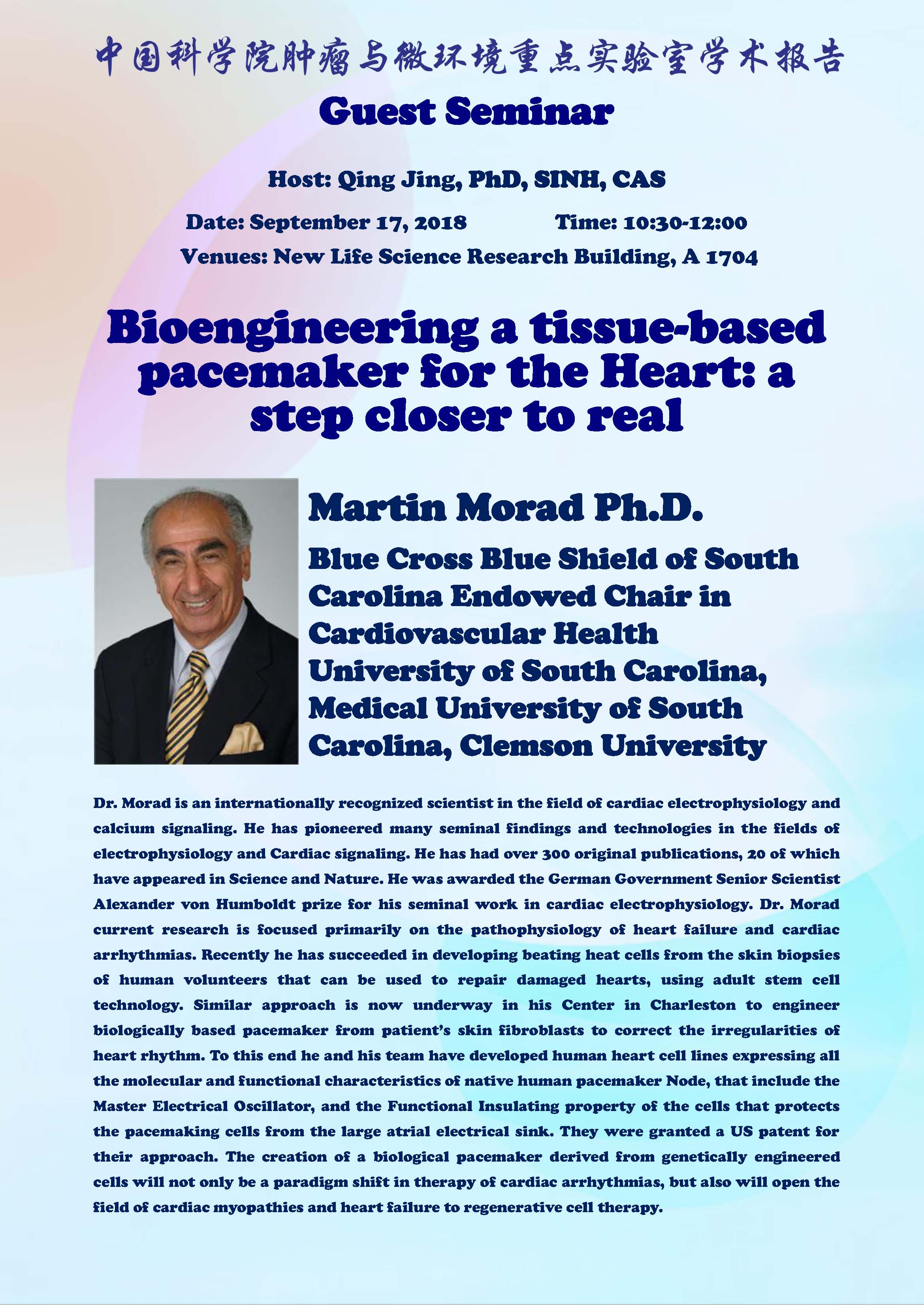 中科院腫瘤與微環(huán)境重點(diǎn)實(shí)驗(yàn)室學(xué)術(shù)報(bào)告:Bioengineering a tissue-based pacemaker for the Heart: a step closer to real