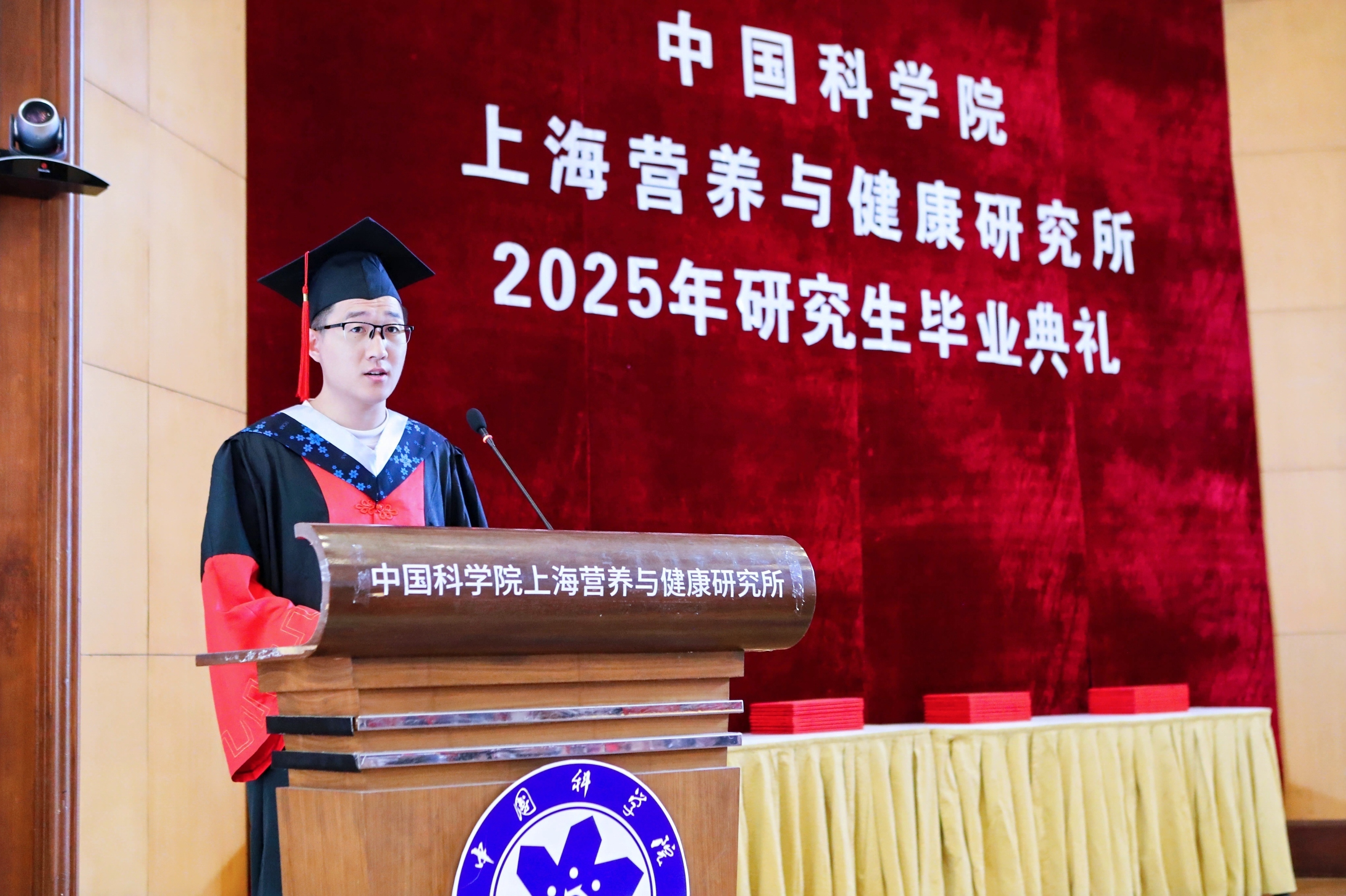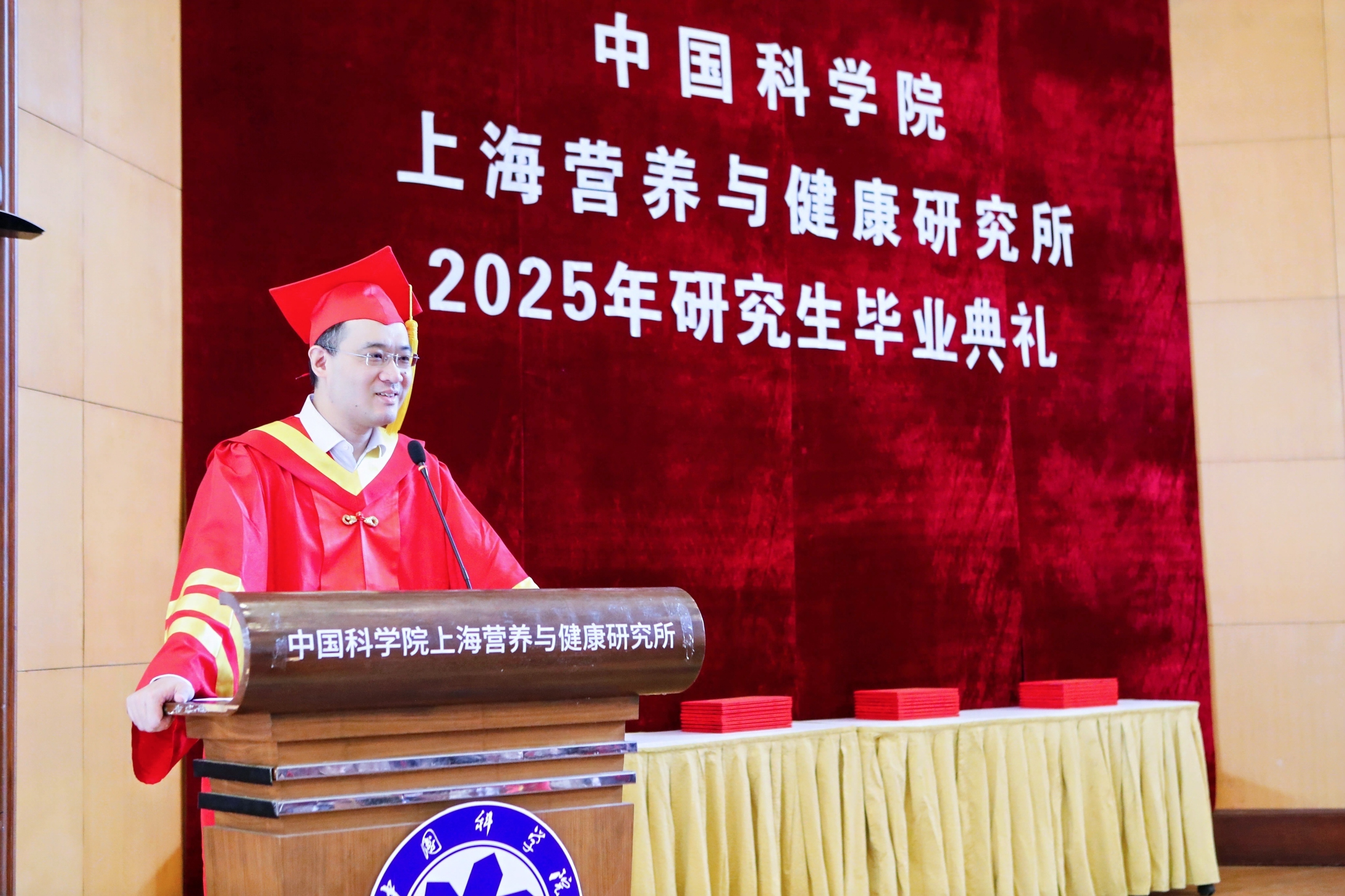 6月20日,中國科學(xué)院上海營養(yǎng)與健康研究所2025年研究生畢業(yè)典禮在生科大樓報告廳舉行。營養(yǎng)與健康所所長、黨委副書記汪思佳,副所長、學(xué)位評定委員會主席胡國宏,所務(wù)委員、學(xué)位評定委員會副主席邵振,學(xué)位評定委員會委員孔祥銀、王躍祥,導(dǎo)師代表熊燕、黃濤、王振,2025屆畢業(yè)生與畢業(yè)生親友、研究生處教育管理干部等100余人齊聚一堂,共同參與了這一盛典。畢業(yè)典禮由邵振主持。