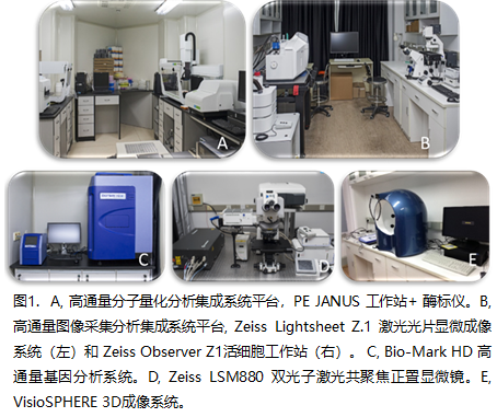 “Uli Schwarz量化生物學(xué)質(zhì)量控制平臺” 占地250平米左右,為計算生物學(xué)所提供基本的實驗技術(shù)支持、實驗場地和技術(shù)培訓(xùn)等。該平臺由DNA實驗室、 RNA實驗室、有毒試劑實驗室、實驗解剖室、樣品存儲區(qū)、公共細(xì)胞房、高通量分子量化分析集成系統(tǒng)子平臺(圖1A)以及高通量圖像采集分析集成系統(tǒng)子平臺(圖1B)組成。該平臺不僅配備了基礎(chǔ)的細(xì)胞分子生物學(xué)常用儀器,而且還配備了先進的諸如激光光片顯微成像系統(tǒng)、雙光子激光共聚焦正置顯微鏡等大型儀器。不僅面向中國科學(xué)院上海營養(yǎng)與健康所及其他兄弟單位開放,還面向上海市及國內(nèi)其它科研單位以及企業(yè)開放。