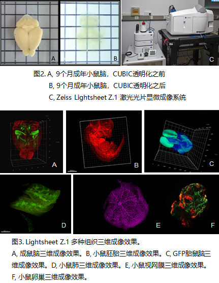 本平臺技術(shù)人員熟練掌握平臺現(xiàn)有儀器設(shè)備,并善于探索適合特殊實驗的條件和方法,能對各類實驗提供很好的實驗幫助。并且該平臺已成熟掌握CUBIC組織透明化的方法(圖2)以及快速成像和三維重構(gòu)的方法(圖3),能夠在透明化全腦以及透明化大樣本(如:胚胎,肌肉,心臟等)的制樣和成像方面提供強有力的服務(wù)與支持。同時,本平臺技術(shù)人員在長時程多樣本的活體成像方面以及雙光子二次諧波成像方面都能做到很好的技術(shù)支撐。