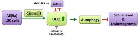 研究人員利用遺傳小鼠模型,證明Caspase-3缺失可以延緩t(8;21)白血病的發(fā)生。從分子水平研究揭示Caspase-3能夠直接切割自噬調(diào)控因子ULK1D458位點(diǎn), Caspase-3的缺失能夠促進(jìn)ULK1蛋白激酶的上調(diào),從而促進(jìn)白血病細(xì)胞自噬。白血病中蛋白水解酶Caspase-3,一方面通過(guò)水解ULK1蛋白激酶,另一方面也可以通過(guò)mTOR/P70S6K/4EBP1信號(hào)通路,抑制細(xì)胞自噬發(fā)生。王蘭研究組通過(guò)與邁阿密大學(xué)腫瘤研究中心Stephen Nimer教授合作,證明Caspase-3及其調(diào)控的細(xì)胞自噬信號(hào)通路與白血病發(fā)生緊密相關(guān)。